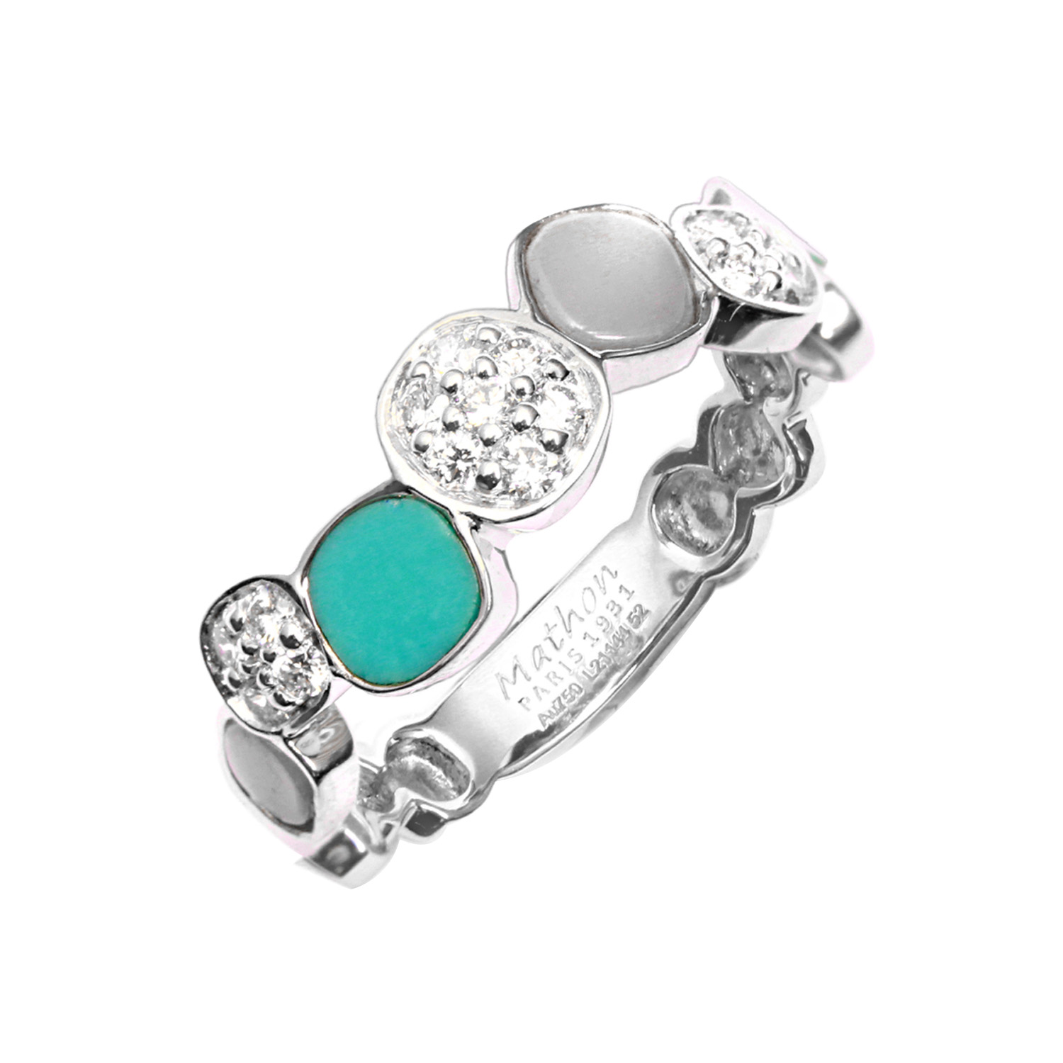 The Florin line is part of Les Intemporelles by Maison Mathon. This collection of small earrings, pendants and rings combines a refined design with a wide variety of colors. Discreet yet original, the pieces in the Florin line can be worn every day. Ornamental stones such as turquoise, malachite, carnelian and lapis lazuli alternate with white mother-of-pearl. The reflections of the mother-of-pearl create a mirror effect that contrasts subtly with the brilliance of the diamond pavé. Malachite, from the Congo, has veins of different shades of green on its polished surface. A stone for travelers, it offers protection and security. Turquoise from Iran has a luminous blue color. It is synonymous with strength and success. Afghan lapis has an intense starry-blue color, illuminated by the flashes of golden pyrite it contains. Carnelian is a lovely brick red, contrasting with the pure white of mother-of-pearl.