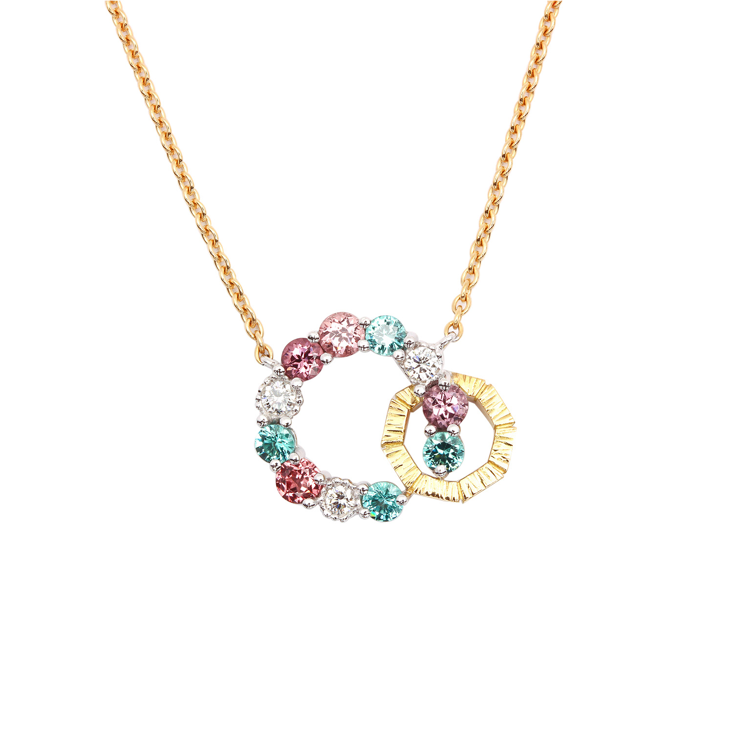 L’or blanc et l’or jaune s’enlacent pour former des bijoux, aux allures de couronnes de fleurs, ornées de pierres colorées telles des fleurs en bouton – spinelles rouges et violets, diamants et tourmalines vertes – rappelant ainsi les variétés du Marché, les effets de matière renforcent le contraste de ce mariage : d’une part les lignes géométriques marquées par la ciselure et d’autre part, les courbes dessinées par le sertissage des pierres.